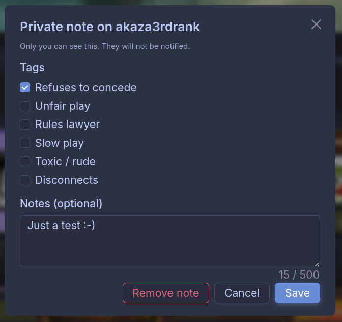 You can now attach a private note to any other player. Pick from a short list of preset tags — refuses to concede, rules lawyer, slow play, toxic, disconnects — and add an optional comment in your own words.