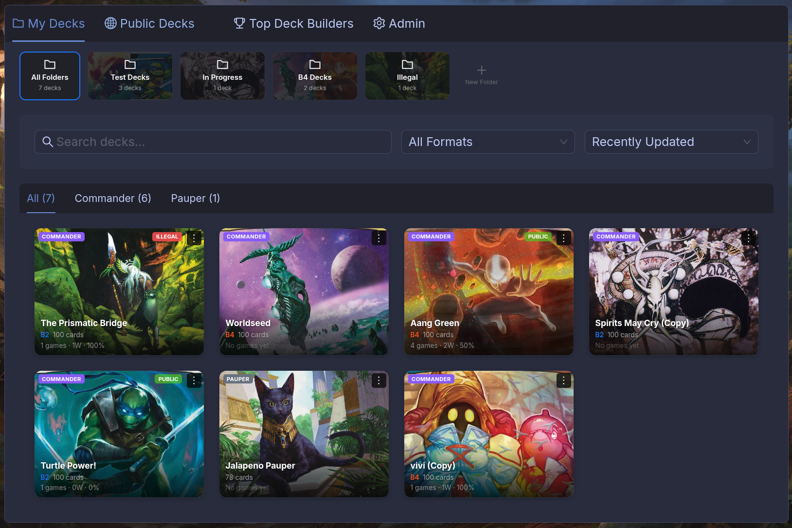 Once you've got more than a handful of decks, things get messy. Supporters can create folders to keep everything sorted — by format, commander, or whatever makes sense to you.